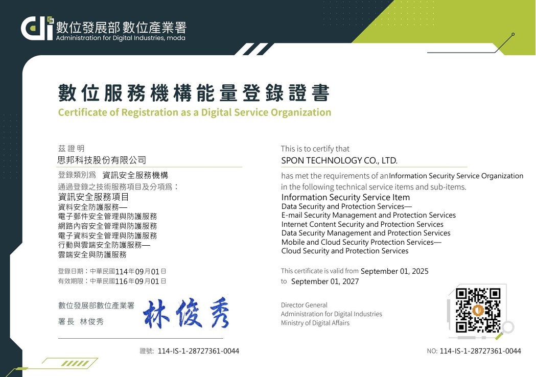 思邦科技於2025年9月再次通過114年度數位發展部數位產業署認證,獲頒『數位服務機構能量登錄』證書。