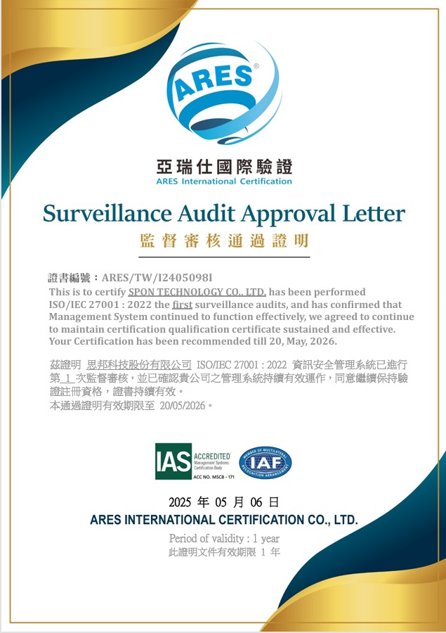 於202年5月取得ISO/IEC 27001:2022監督審核通過證明,確保資訊安全管理系統持續有效運作。